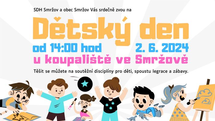 SDH Smržov a obec Smržov vás srdečně zvou na Dětský den, který se koná v neděli 2. června od 14:00 hodin u koupaliště ve Smržově.